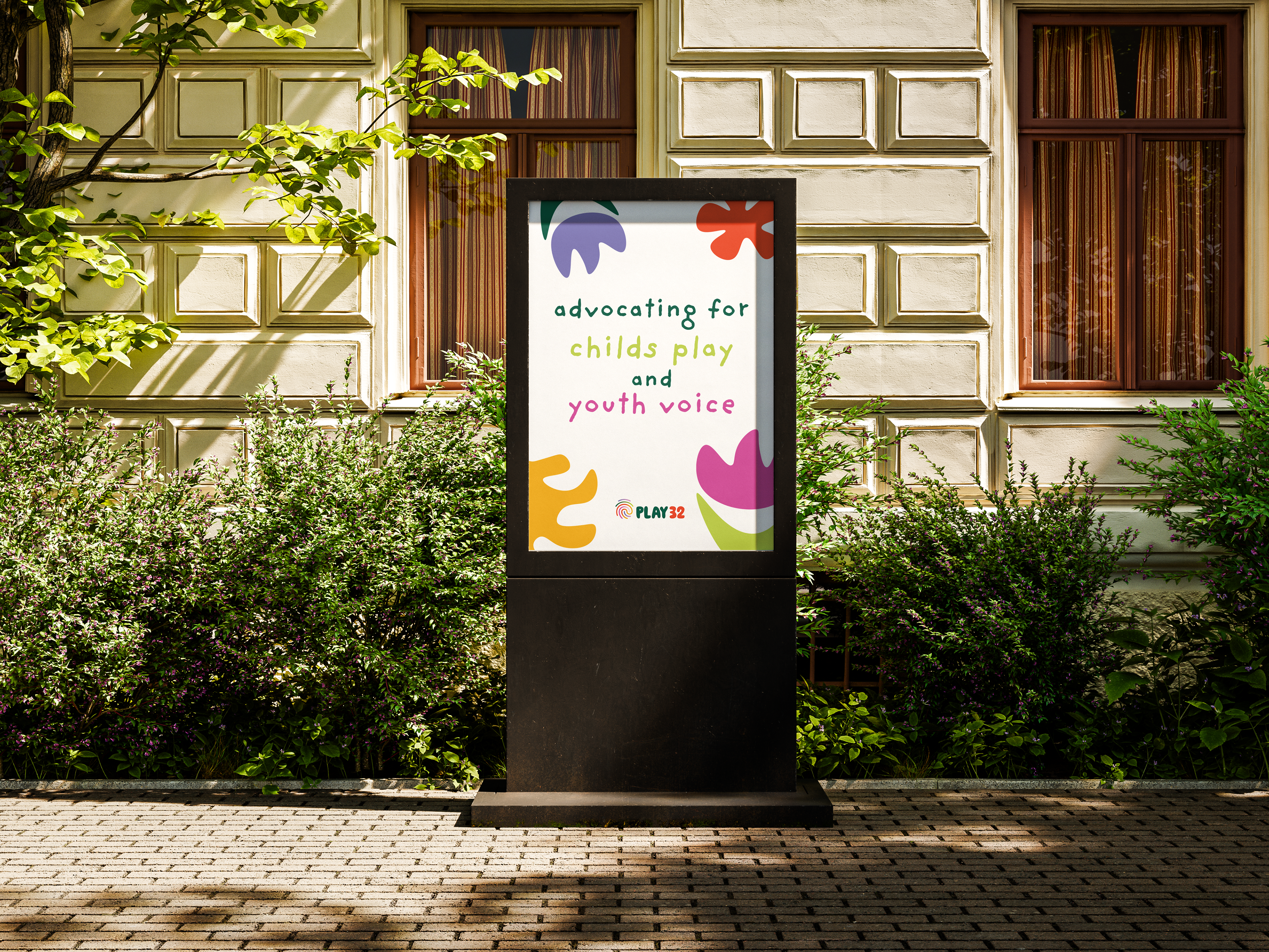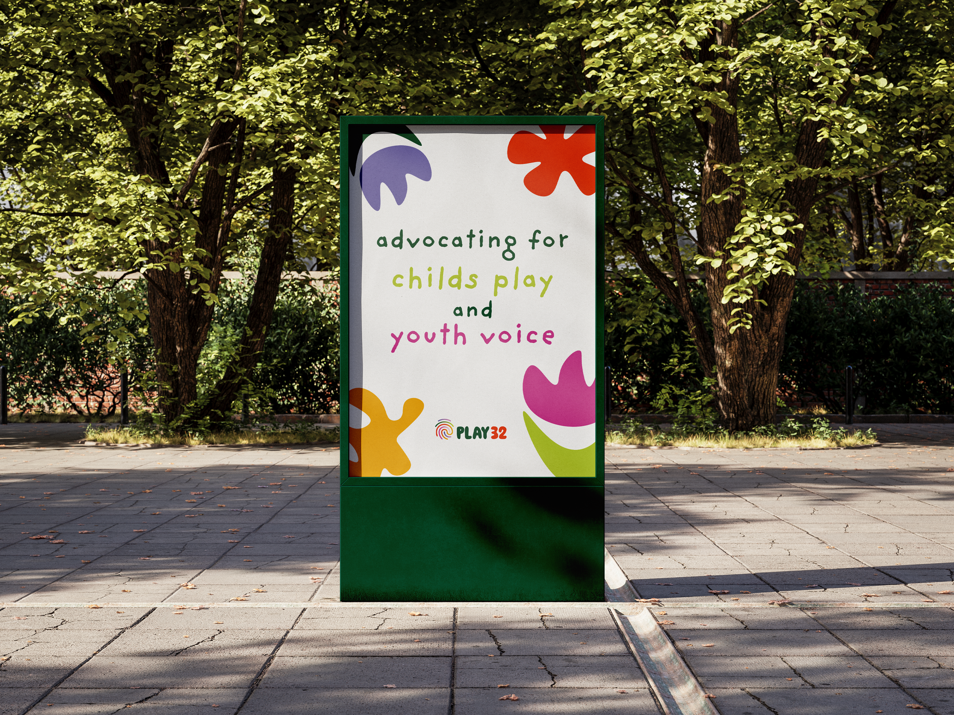 The final brand identity showcases a vibrant, dynamic visual language designed for applications across print, digital, and environmental graphics. The logo and supporting graphics reinforce the message of participation, creativity, and childhood joy. This project highlights how thoughtful visual communication design can bring purpose-driven branding to life, creating meaningful connections with audiences.